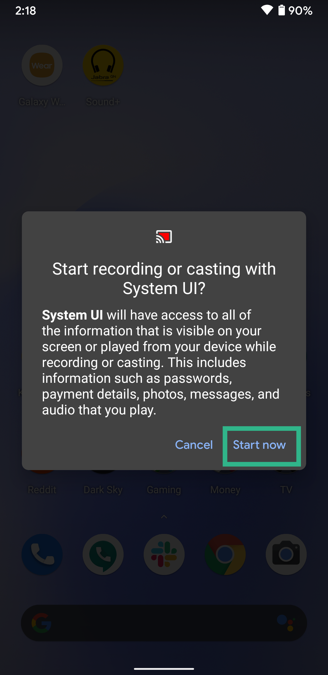 The native screen recording feature will be available inside Quick settings, tapping which you’ll be warned that the system will now have access to the entire screen. You can start recording by tapping Start now at which point a red-colored icon will pop up at the status bar.