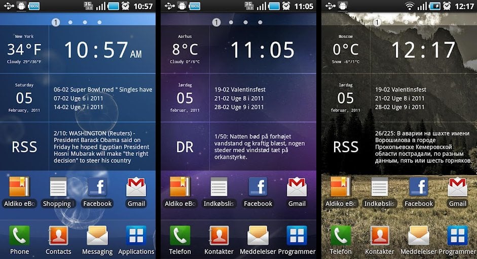 Glass Widgets contains widgets for time, as well as for weather, calendar and RSS feeds (either preset or manually subscribed ones). They look great, and provide quite a lot of information on the screen, with a transparent glass background that lets you see your wallpaper despite having such a big widget on the screen. Get this one if you’re looking for a widget that shows useful information on your homescreen.