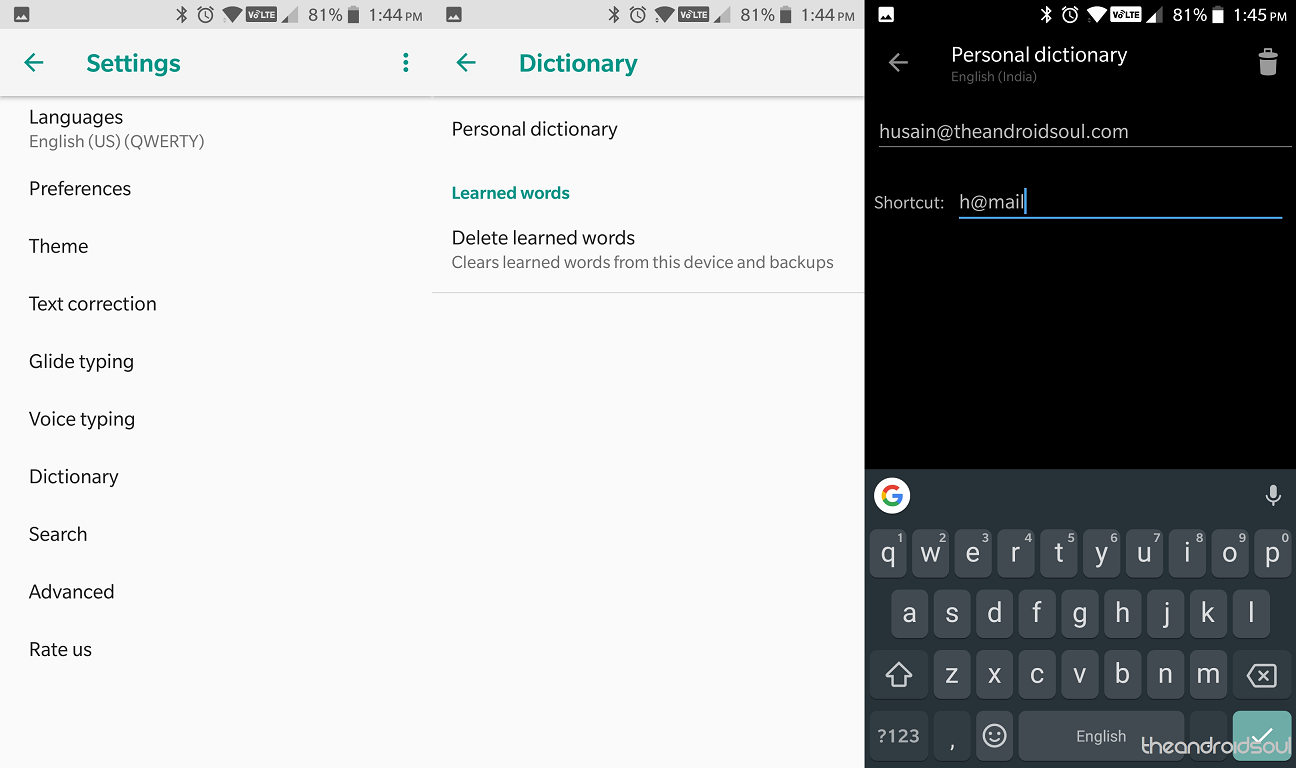 There are certain words, phrases, and even sentences in the form of your email address, your phone number, or your home address that you often end up texting around. While Google has an excellent auto-fill service to help complete your regularly typed in words, there is also the ability to set up shortcut words, which would then bring up the sentences or phrases you have saved in the Personal dictionary.