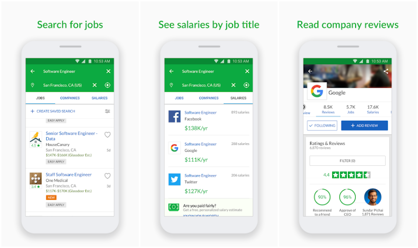 Glassdoor is a very sophisticated and contemporary app with a rating system for companies with respect to their work culture, quality of reimbursements etc which helps prospective workers of a company to get a basic idea of what they can expect if they make it. Additionally,  a user can use a tool known as “Know Your Worth” to estimate his market value in the current scenario, compare his skill set with the average worker of that field and gauge is a base salary.