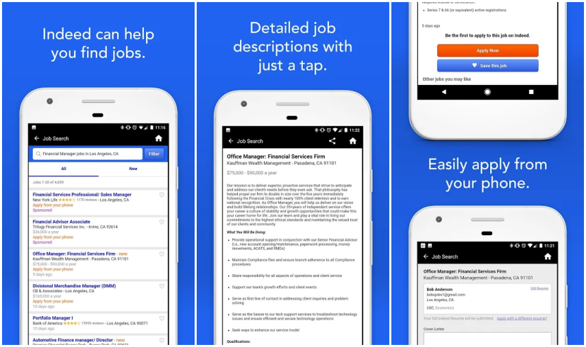 Indeed Job Search is a simple, neat and effective app. The user stores his resume on Indeed which is then forwarded by the app to every recruiter the user applies to. So applying via Indeed is a very simplified 4-5 steps process as opposed to apps like LinkedIn which have much more complex ecosystems that the user has to navigate.