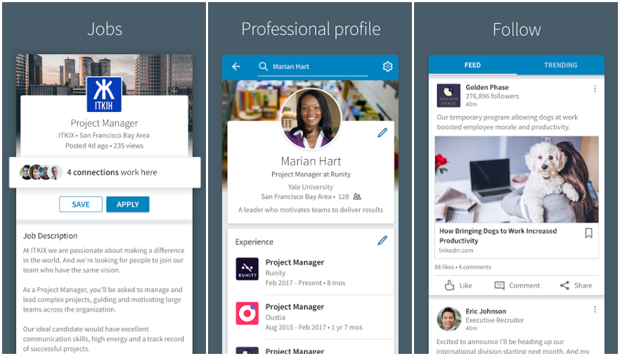 The app makes it easy to apply for any job within a matter of seconds and follow recruiters for job openings and updates.  However, the platform is now diluted with fake job openings so exercise caution before applying.