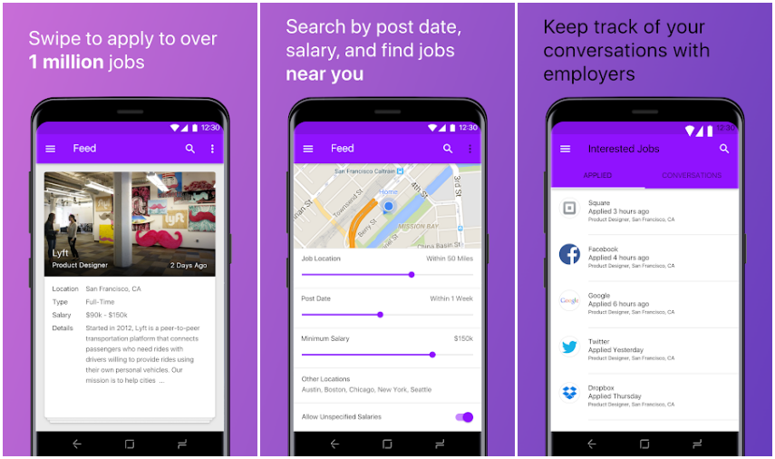 ZipRecruiter handpicks and curates job openings from hundreds of job boards and helps speed up the job application process in its entirety. The first thing the app does is set the base for the minimum salary expected and then, based on that, conducts its search for potential jobs for the user. It notifies you when the recruiter checks the user’s profile and tries to persuade him to enhance his profile by filling in the details in greater detail.