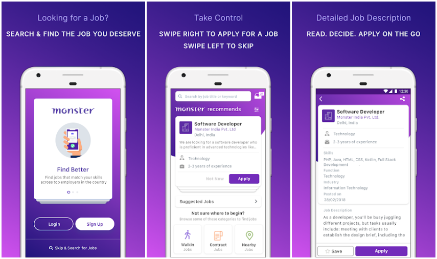Google Search is the most rudimentary way to look for a job. Just search for a job the way one searches for anything on it, and relevant results will pop up in a jiffy. The better part about using Google Search is that it brings in results from numerous other apps, bringing you the greatest number of results you could hope for. And, it doesn’t cost a dime. So what’s not to like?