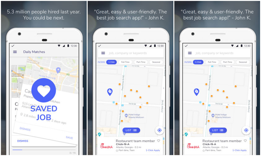 Snag (formerly named Snagajob) is an easy-to-use job finder and career builder app. Searching for full-time careers or part-time jobs is equally painless. Snag makes easily accessible unconventional and limited jobs such as restaurant jobs, retail, hospitality, and seasonal jobs. Jobs can be applied to with a single click using the user’s Snag profile. The application status of jobs applied for is always visible to the user. The app makes the user undergo a personality test to help the recruiters get a clearer picture of the applicant and aid their decision in choosing or rejecting him.