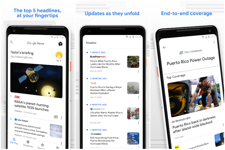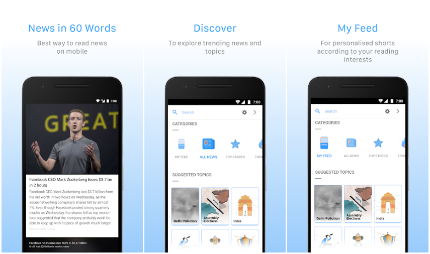 Google News is a news app, period. It collects news from various sources and lists it in a very minimalistic, clean interface. Multiple sources are also brought in to report the same news, to give a reader a greater perspective and greater insight into the event being discussed.