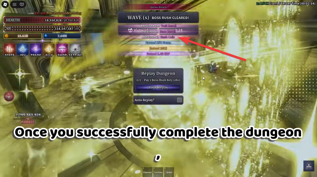 Only successful completion of the dungeon grants Rush Coins, so surviving the entire boss sequence is important if you want consistent farming results.