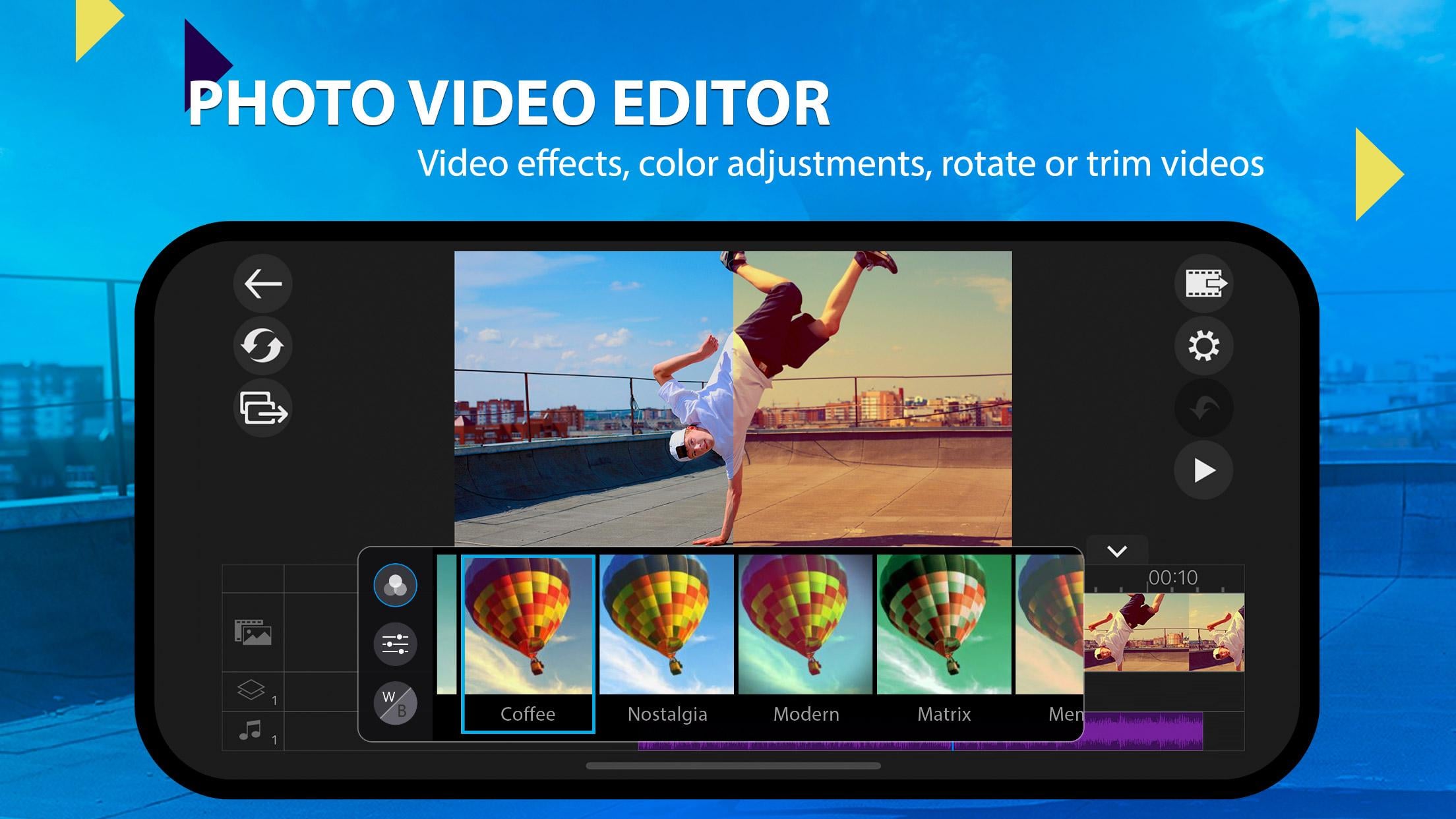 Additionally, the app allows you to import, edit and export Full HD videos as well which is fairly impressive considering its small install size of 30MB. It comes with tons of in-built video effects and filters while giving you the ability to add text and stickers on your videos as well.