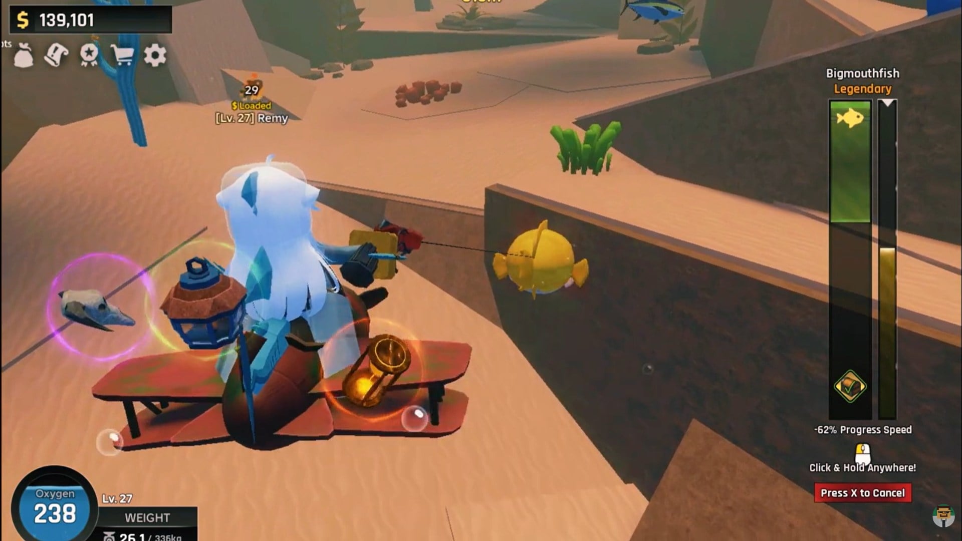 Bigmouthfish in Abyss is a legendary fish located in Ancient Sands, commonly near Crazy Jeff’s area. Its spawn is random but manageable through zone patrol. With a Boat Tube for oxygen stability and a Wasted Gun for reliable capture, you can secure this legendary with minimal resistance. The challenge lies in locating it, not defeating it.