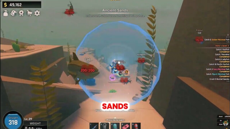 The Boat Tube is essential for oxygen stability in Ancient Sands. Even though the biome offers relatively open visibility, searching for a legendary spawn can take time. Without extended oxygen support, you may be forced to surface repeatedly, disrupting patrol patterns and potentially losing sight of the fish. The Boat Tube allows you to stay submerged longer, scan wider areas in a single dive, and remain calm during the encounter.