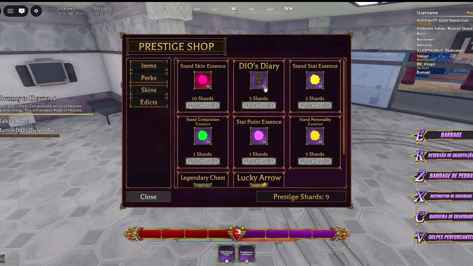| Essential Items | 7 Dio bones (legendary chests), Dio diary (Prestige Shop, 3 chads) |