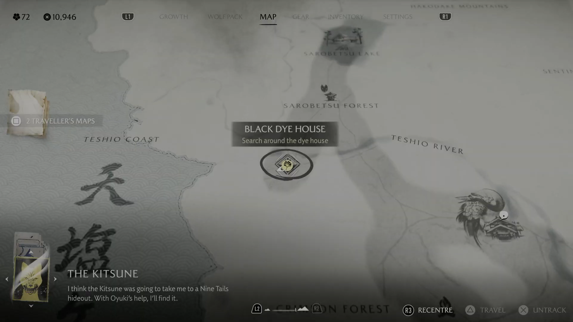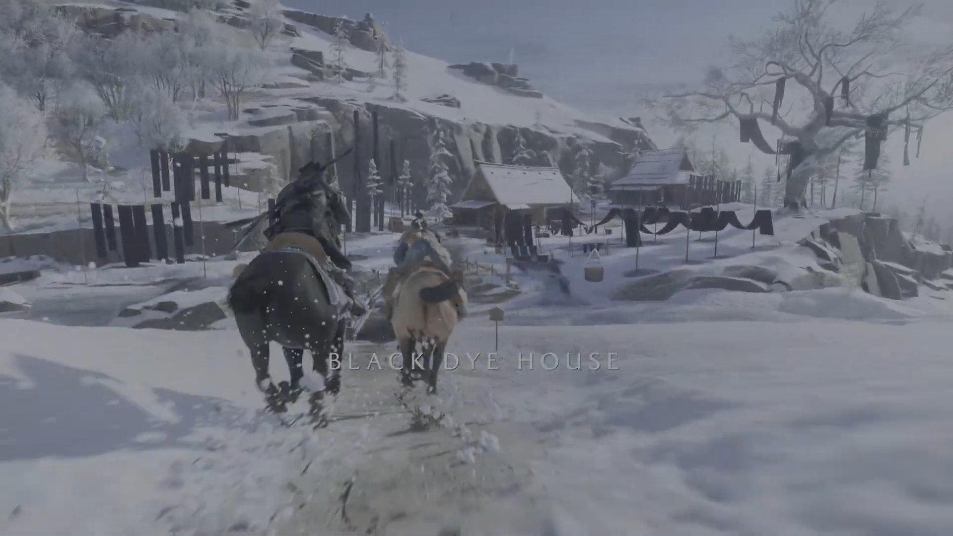 You’ll find the Black Dye Merchant in the Teshio Ridge region, specifically on the western bank of the Teshio River and just beneath the shadowy Sarobetsu Forest. Her hut is marked by black cloth banners, which signal the right house as you approach from the road northwest of the Red Crane Inn. The area is surrounded by thick mist and trees which add to the atmosphere.