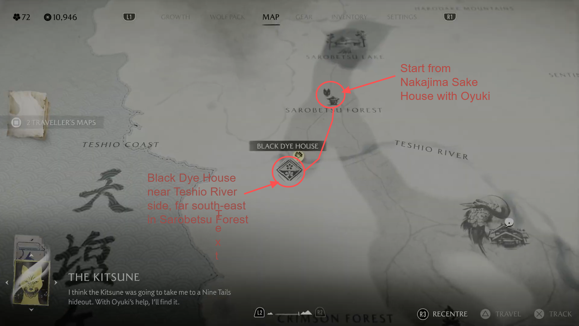 Follow his directions and with Oyuki to find the Black Dye House in Sarobetsu Forest.