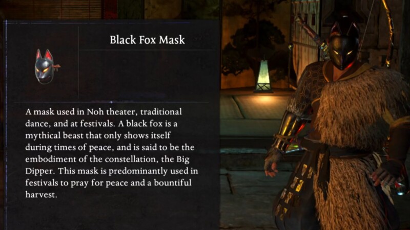 The in-game description references traditional Noh theater and festivals. The Black Fox is described as a mythical entity associated with peace and celestial symbolism, including ties to the Big Dipper. This aligns with Nioh’s broader integration of Japanese folklore into gear design.