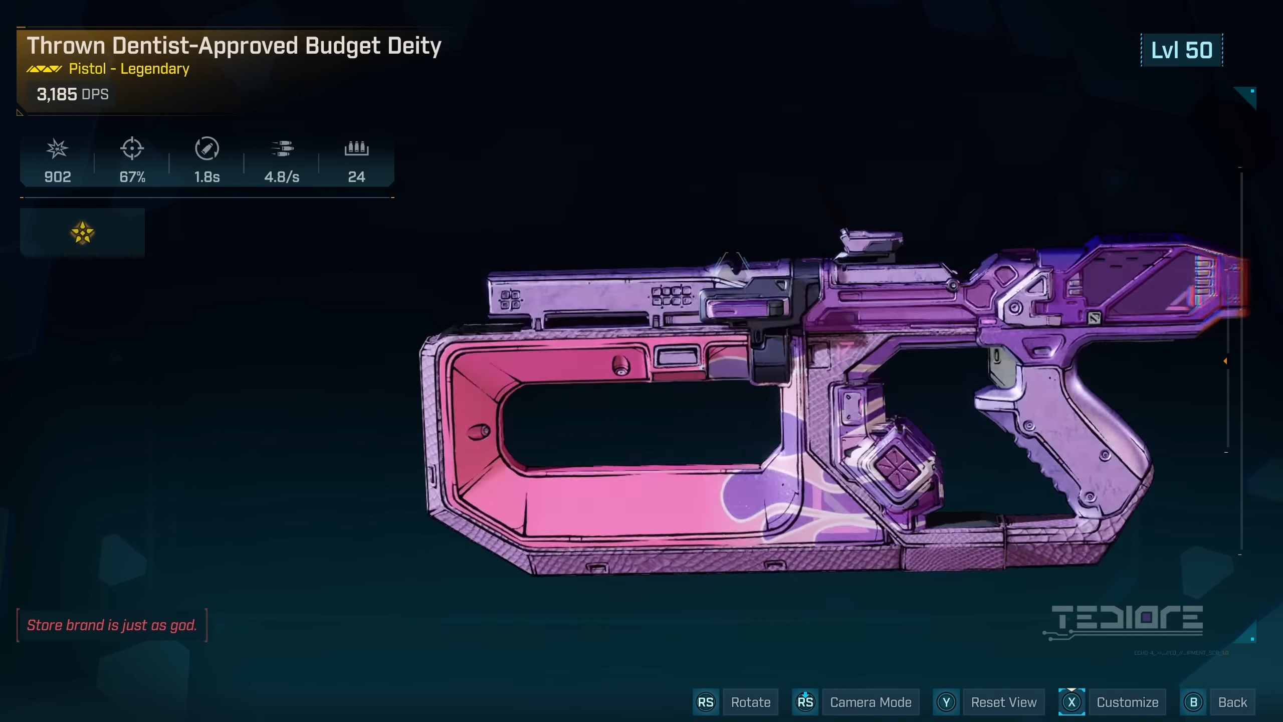 - Budget Deity (Pistol): A Tediore pistol producing Combo Orbs on throw, marking enemies for increased damage.