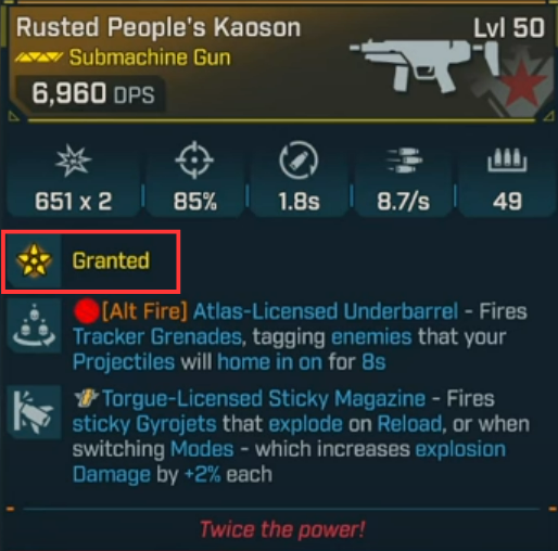 - The legendary mod Granted is seen on some weapons, such as the Vladof SMG Kaoson.