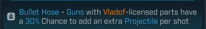- Its primary effect (“licensed-part effect”) is to give Vladof-licensed weapons a 30% chance to add an extra projectile per shot.