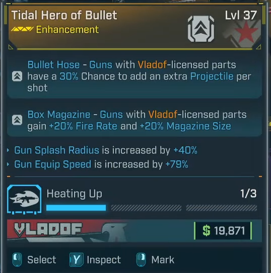 Choose or obtain a weapon with Vladof parts. The more parts from Vladof (barrel, magazine, etc.), the better, because it ensures compatibility with the enhancement’s core effect.