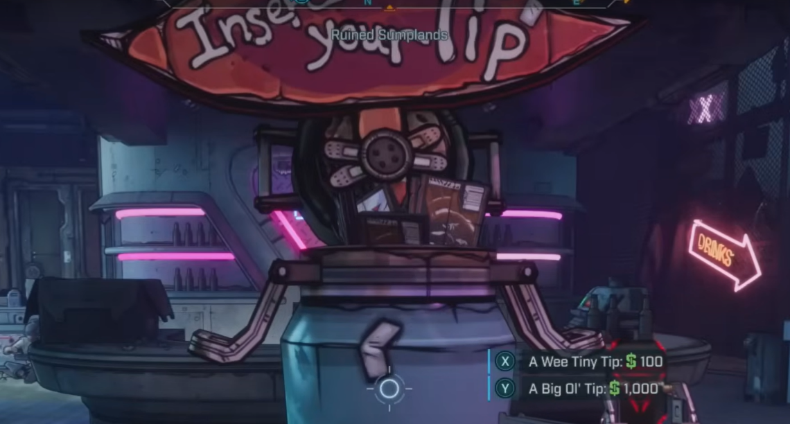 Once inside the bar, find Moxxi’s Tip Jar on the main counter. Interact to start tipping.