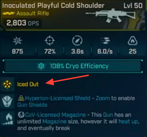 - Its Iced Out effect is a legendary trait in Cold Shoulder rifle that ensures constant freezing, unpredictable bullet paths, homing chances, and area damage bursts.