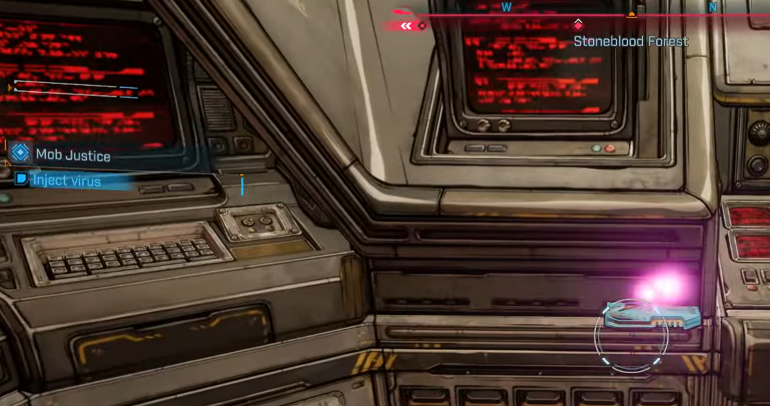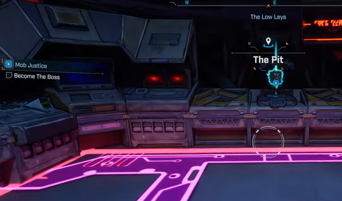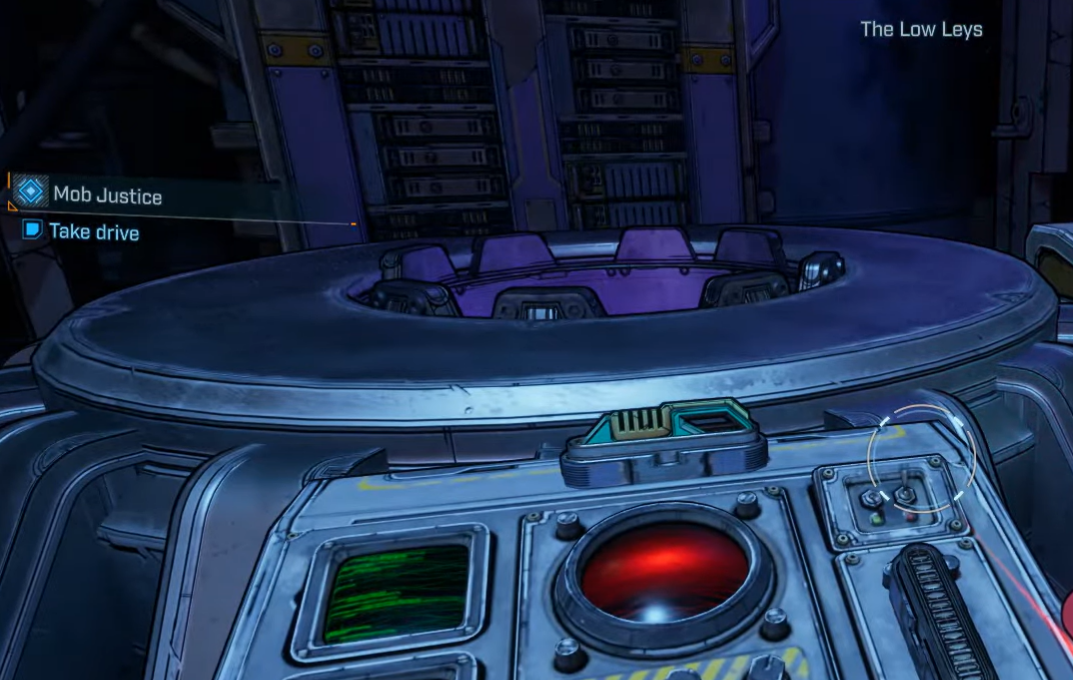 Accept Mob Justice from The Boss in The Pit and pick up the drive from the console on the left. (Objective: Take the drive.)