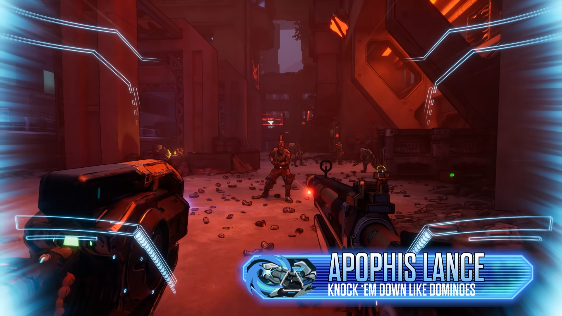 - APOPHIS Lance: An off-hand weapon firing Shock projectiles by default. Augments allow switching to a taser, laser, or Corrosive globs, offering flexibility for range or status effects.