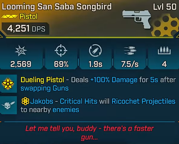 Variants will include different alternate fire perks, but the legendary dueling buff and Jakobs crit ricochet effect are always present.