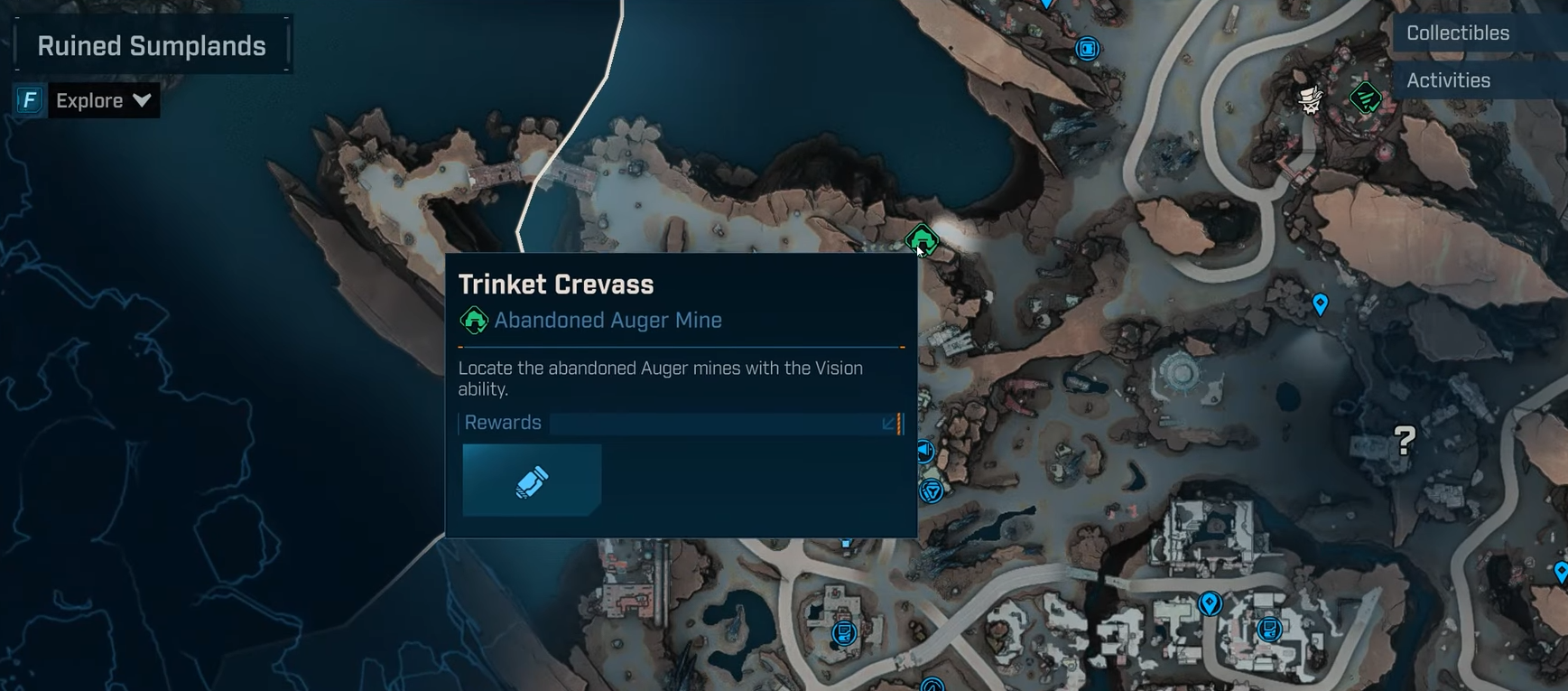 Travel to the northwest section of Ruined Sumplands, Carcadia Burn. Locate the green icon for the Trinket Crevass Abandoned Auger Mine on your map.