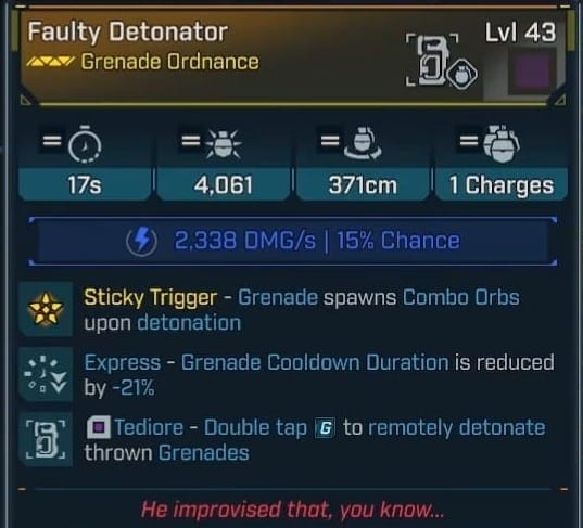 | Faulty Detonator | Grenade | Explodes with a chain reaction, bouncing between enemies for multi-target damage. | 4-8% |
