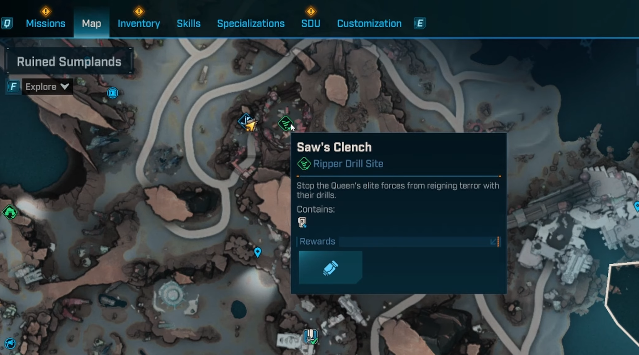 Head north within Ruined Sumplands to find Saw’s Clench marked as a drill site on the map.