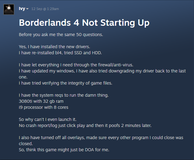 You hit play on Borderlands 4, ready to dive into that chaotic vault-hunting world, only for Steam to tease you with a loading spinner that goes nowhere. Frustrating, right? Since its September 12, 2025 release, thousands of PC players have reported the game refusing to launch, contributing to its initial "mostly negative" Steam reviews that have since nudged up to "mixed." To showcase their frustration, Steam users stuck with Borderlands 4 not launching on the platform swirled with questions, comments, and some even provided answers.