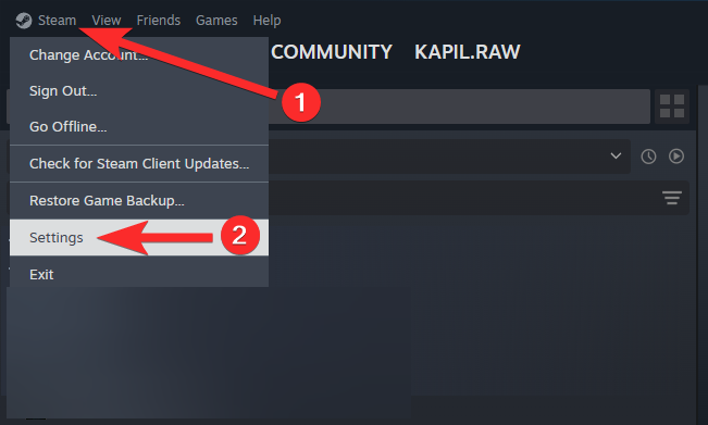 Open Steam and click on the Steam option in the top-left corner. From the dropdown, select Settings to access the main menu.