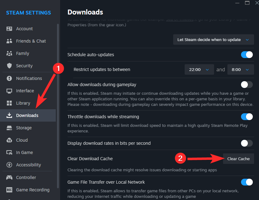In the Settings window, go to the Downloads section. Scroll down and click on "Clear cache".