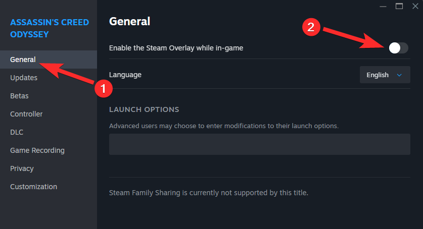 If you want to disable the overlay for a single game instead of globally, go to your Library, right-click on the game, and select Properties. Under the General tab, uncheck Enable the Steam Overlay while in-game.