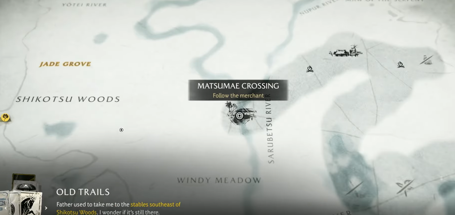 Players encounter the "Building Bridges" side quest in the Matsumae Crossing, set in the eastern part of the Old Stables within the Yotei Grasslands. You’ll begin by talking to the Matsumae Commander, who provides the necessary context to start the mission and gives a clue card to set events in motion.