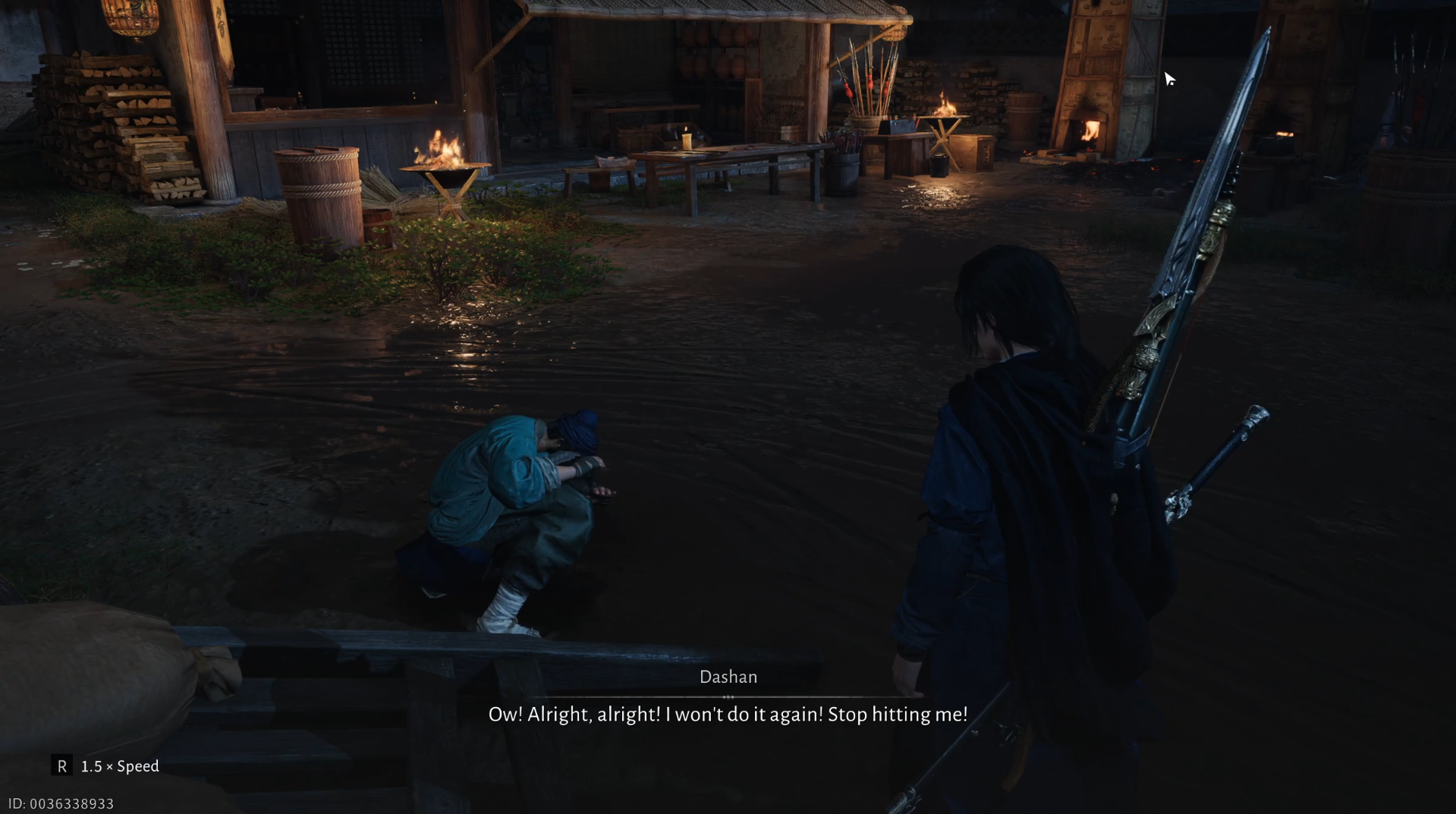 Head into the weapon shop directly in front of Dashan and eavesdrop on the two bandits talking inside.