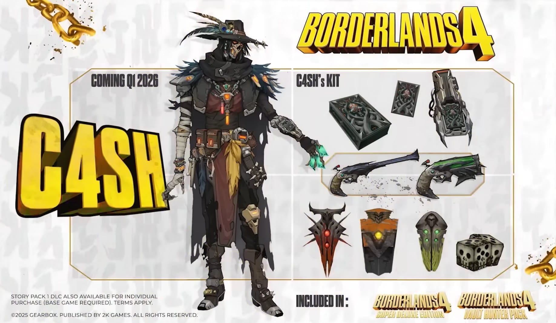 To unlock C4SH, you need either the Super Deluxe Edition of Borderlands 4, the Vault Hunter Pack, or a direct purchase of the “Mad Ellie and the Vault of the Damned” Story Pack. These content bundles will also feature several cosmetic rewards including heads, weapon and vehicle skins, and drone customizations. This pack launches the 2026 content roadmap, with another new Vault Hunter confirmed for later in the year.