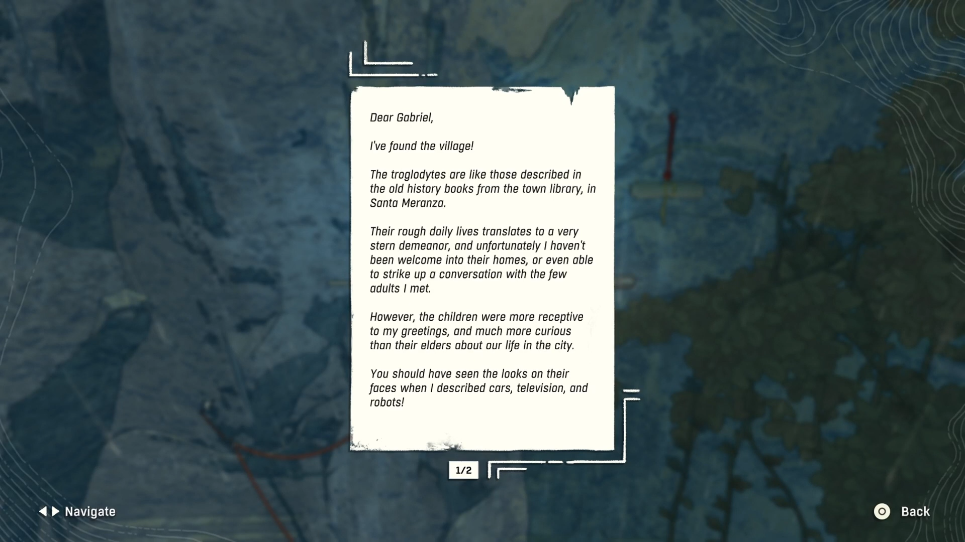 | A Letter of Hope (Gabriel/Roberto letter) | On a wall between the Village and the Child areas | During the climb up from the Village, immediately after a small “go this way” decision | “Dear Gabriel…” starts the letter, then “Letter of hope… Okay, found that.” |
