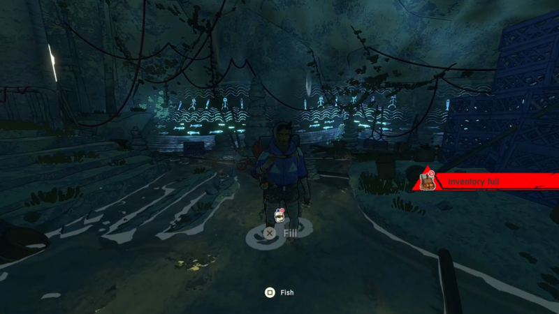 - A full inventory can block collecting the fish, so space management is part of the loop.