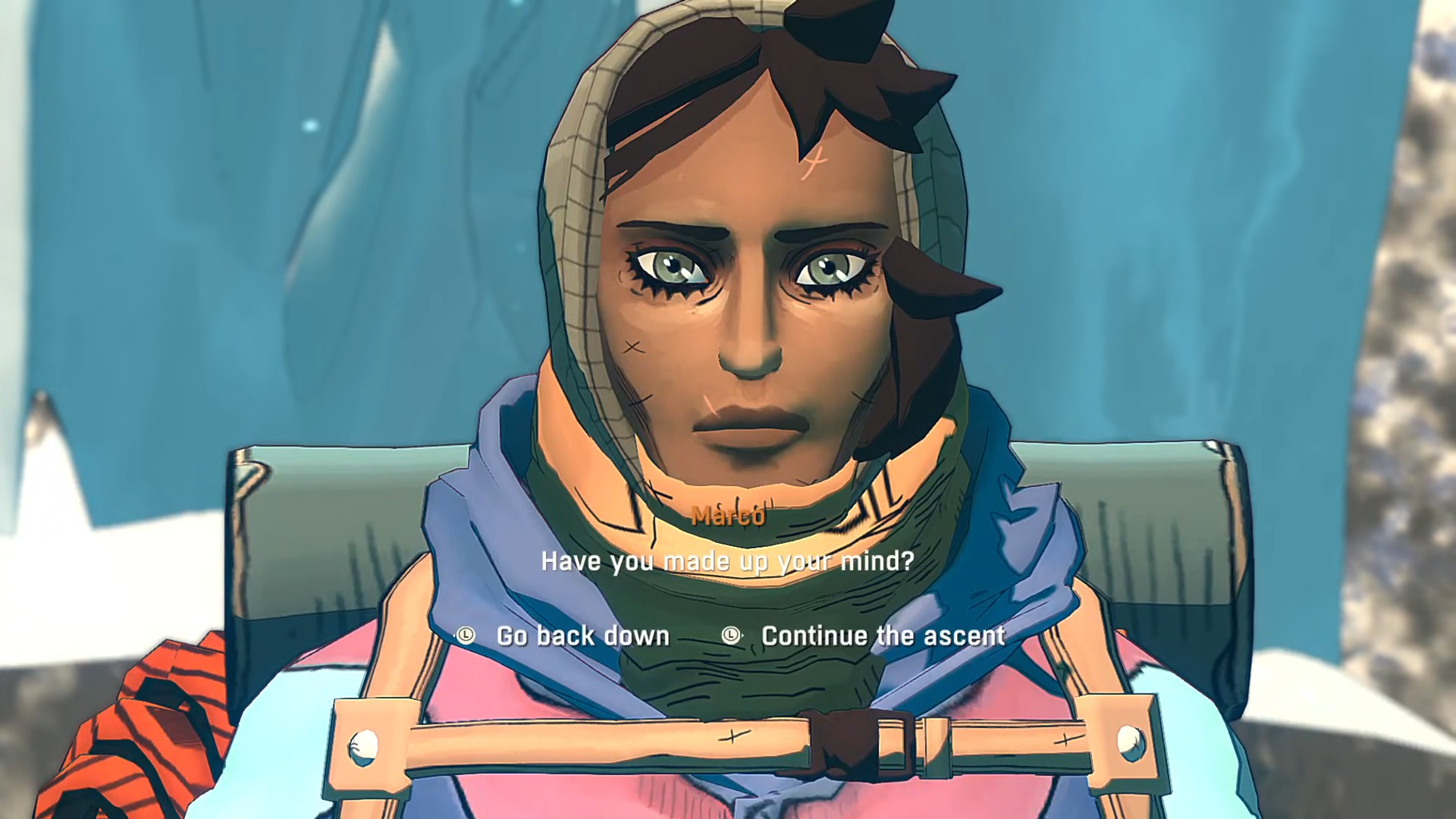 After you choose to descend, the game transitions into the Home ending sequence where Aava accompanies Marco down the mountain, emphasizing survival and companionship over conquest.
