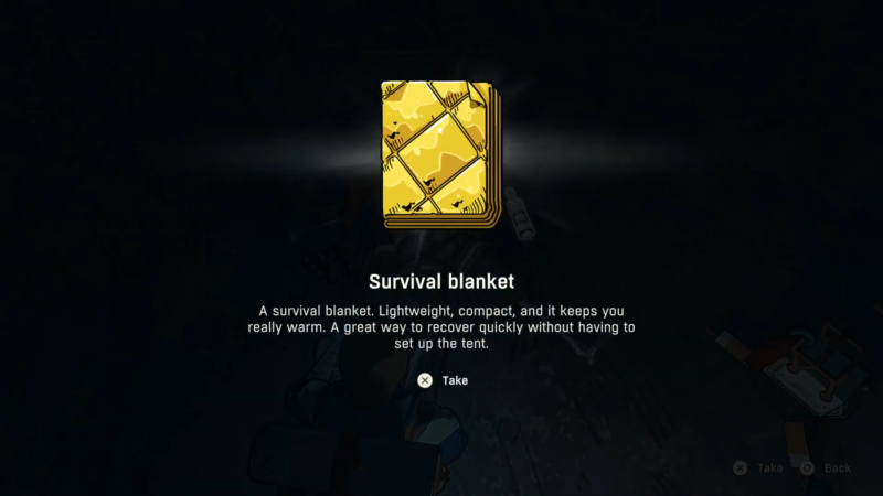 The Survival Blanket matters here because it supports quick recovery without needing a full tent setup, which is ideal when this detour is meant to be fast and low-commitment. Treat it like a momentum-preserver: it helps keep the climb moving after the encounter instead of turning the segment into a long recovery camp cycle. It’s also worth confirming the pickup before leaving the area, since this route is designed to be a single in-and-out.