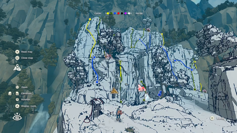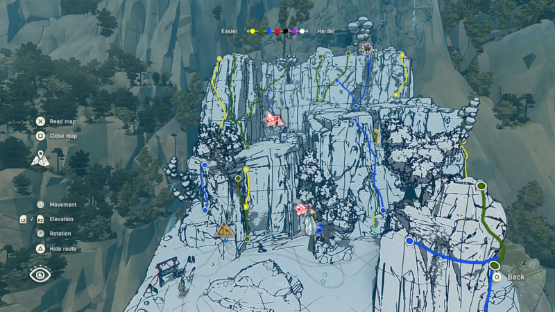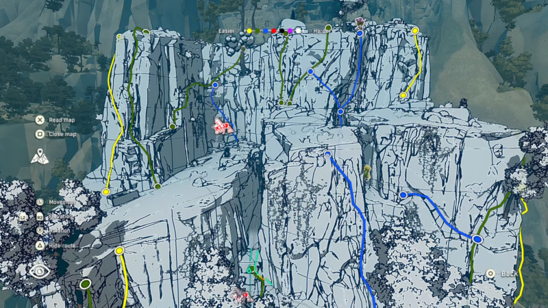 Exploration can reveal maps that show routes and safer paths, and these maps use color-coded difficulty to make route planning easier. Treat the map colors as a planning baseline, then adjust based on conditions like surface texture, available rests, and risk tolerance. When a map isn’t available, route selection becomes more observational—using terrain reading (like looking for cracks and features) to infer easier climbing lines.
