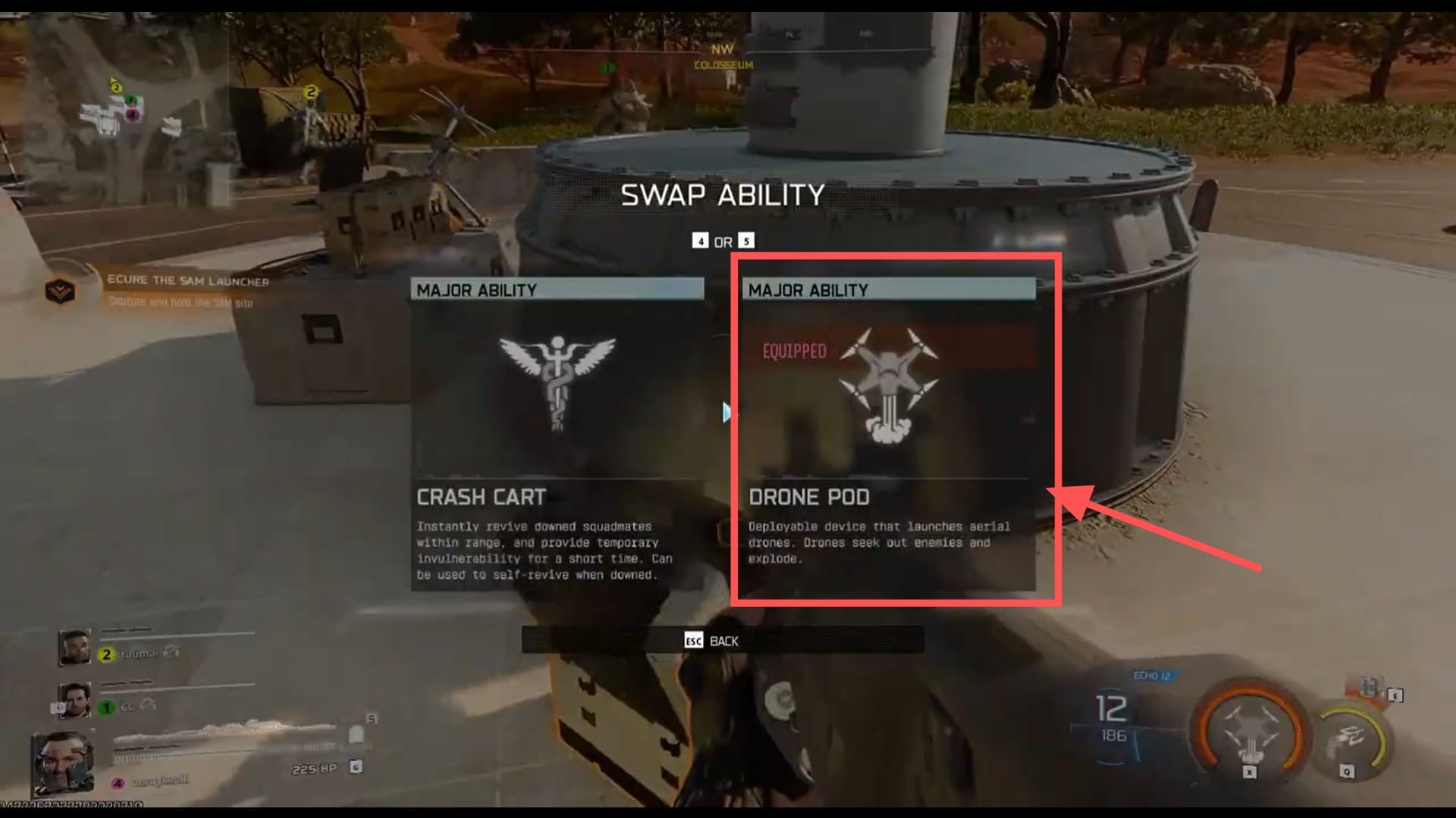 Deploy the pod on the ground; once it activates, the drone launches and begins scanning or engaging nearby enemies. It can automatically detect movement, distract opponents, and sometimes pressure them with light fire. Use it before entering contested areas or to watch your flank.