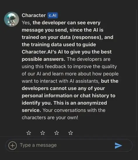 The screenshot above (between a user and Character AI) reveals that while your messages can be accessible to the developers, the platform itself won’t be able to link these messages to your account, meaning your messages will be anonymous.