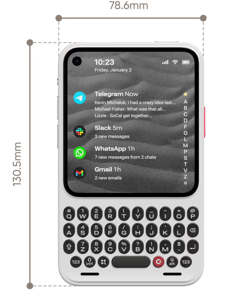 Physically, Communicator looks like a modernized BlackBerry‑style phone: a nearly square 4.03‑inch AMOLED screen sits above a permanently attached physical keyboard in a compact 130.5 × 78.6 × 12 mm body weighing about 170 g. The smaller display and hardware keys are meant to keep focus on typing and triaging messages rather than casual video or social media browsing, which matters if attention management is a priority for you.