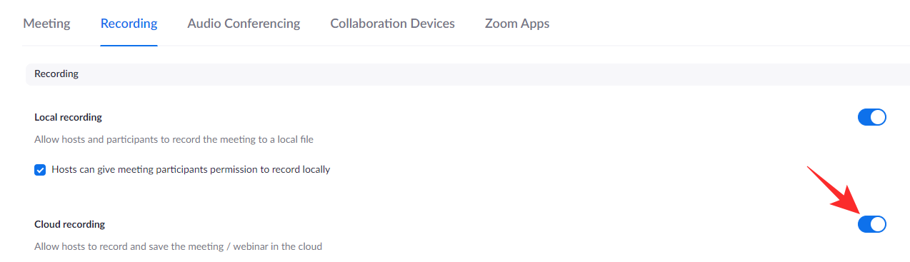 Then, go to the ‘Recording’ tab and make sure the ‘Cloud Recording’ option is enabled.