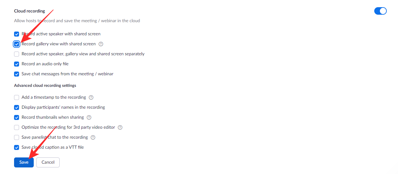 Under the toggle, you will find some cloud recording options. Enable the ‘Record gallery view with shared screen’ option and click on ‘Save’ at the bottom.