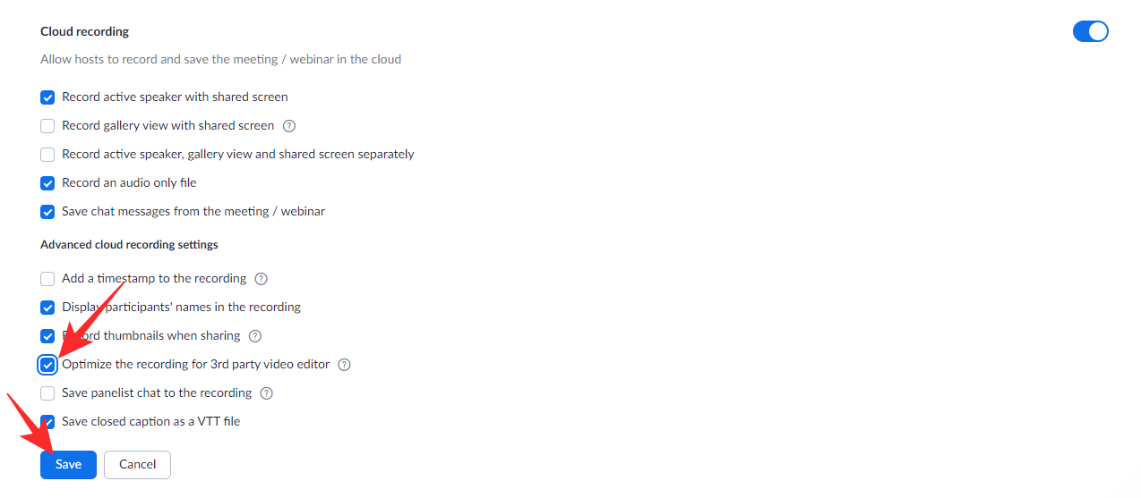 Then, make sure ‘Cloud recording’ is turned on. Under the toggle, you’ll find an ‘Advanced cloud recording settings’ banner, under which the option to optimize recordings for third-party apps would be present. Enable the option and click on ‘Save.’