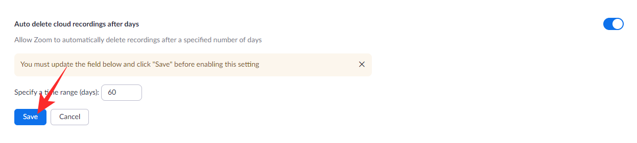 Make sure ‘Cloud Recording’ is turned on and scroll down until you see the ‘Auto delete cloud recordings after days’ option. Toggle it on. Now, you will find the default auto-delete window set to 30 days.