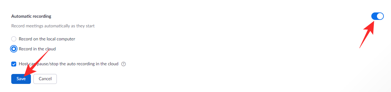 Scroll past the cloud recording option and focus on the ‘Automatic recording’ option. Toggle it on and select either ‘Record on the local computer’ or ‘Record in the cloud.’ If you choose the latter, you will get the option to grant the host the ability to stop auto-recording in the cloud. Check or uncheck the option and click on ‘Save’ to make the changes.